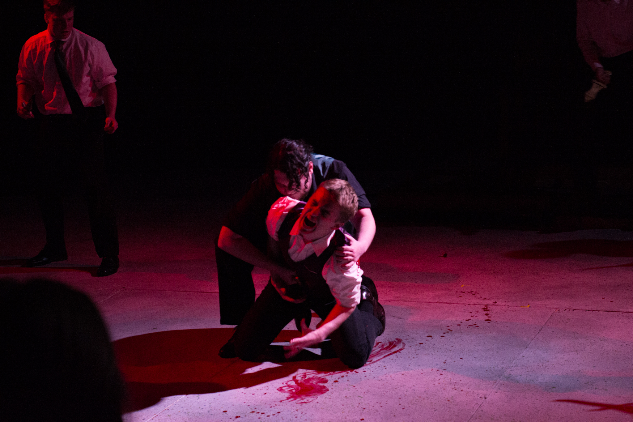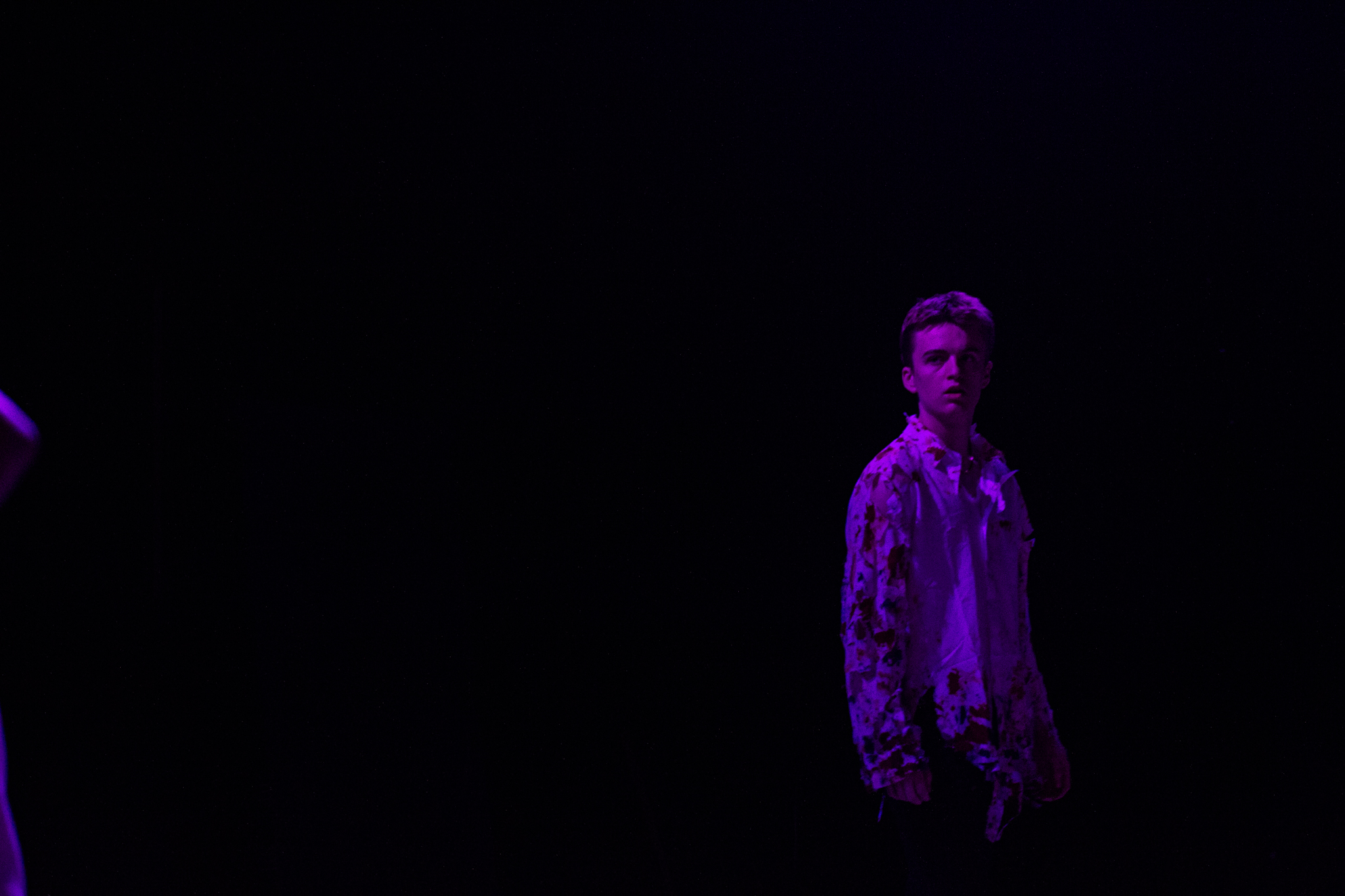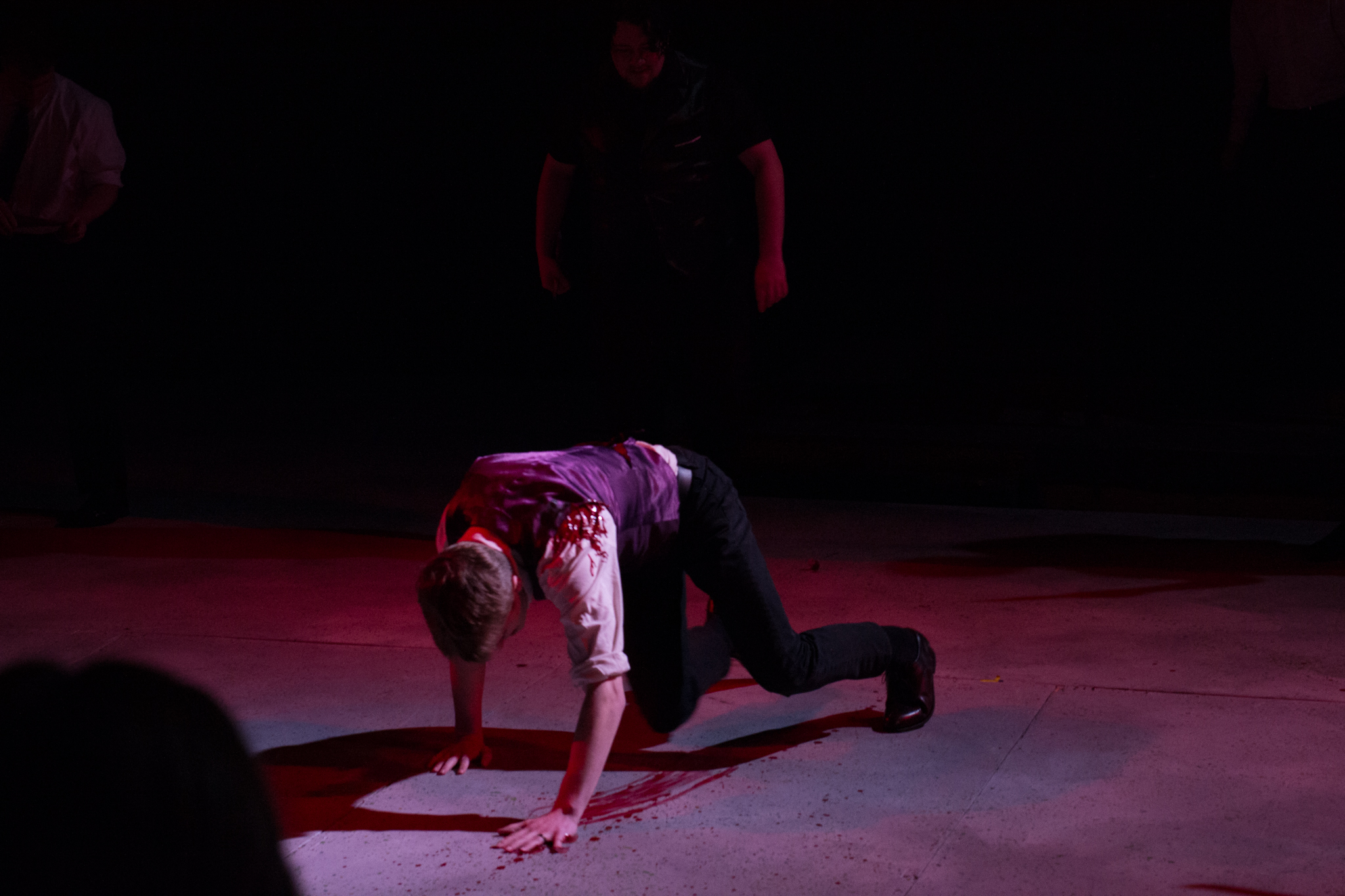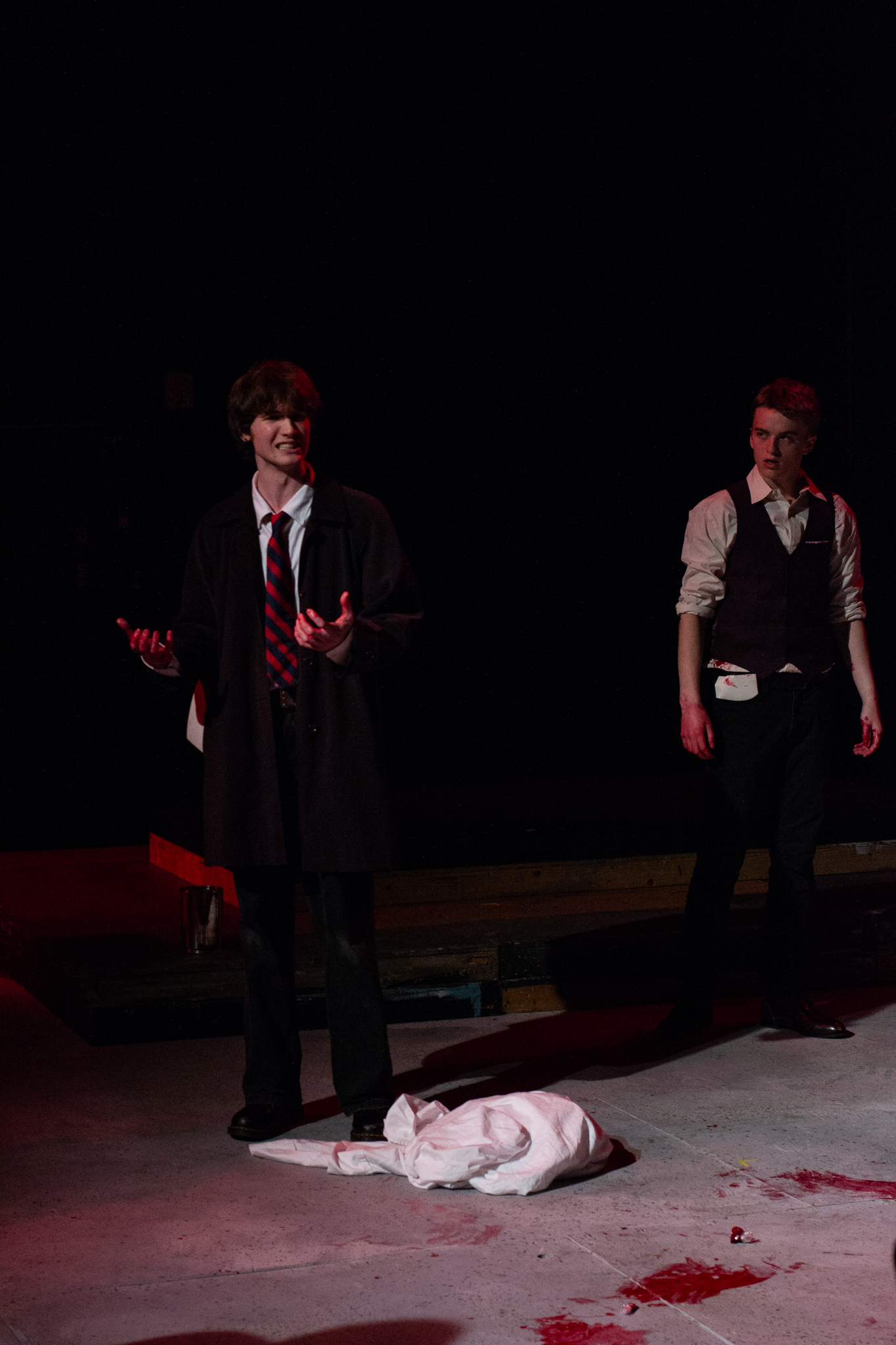 To do this, my version of the play took two minor characters – the Soothsayer, who tells Caesar to beware the ides of March, and Lucius, Brutus’s servant – and expanded them to be show-spanning physical narrators of the story, so that the audience would experience the events of the play through their eyes. In practical terms, this meant melding a number of different minor characters into two show-spanning tracks, heavily recontextualizing certain scenes, and staging a prologue, epilogue, and multiple interlude sequences to highlight the common people as they experienced the events of the play outside of its explicit text.