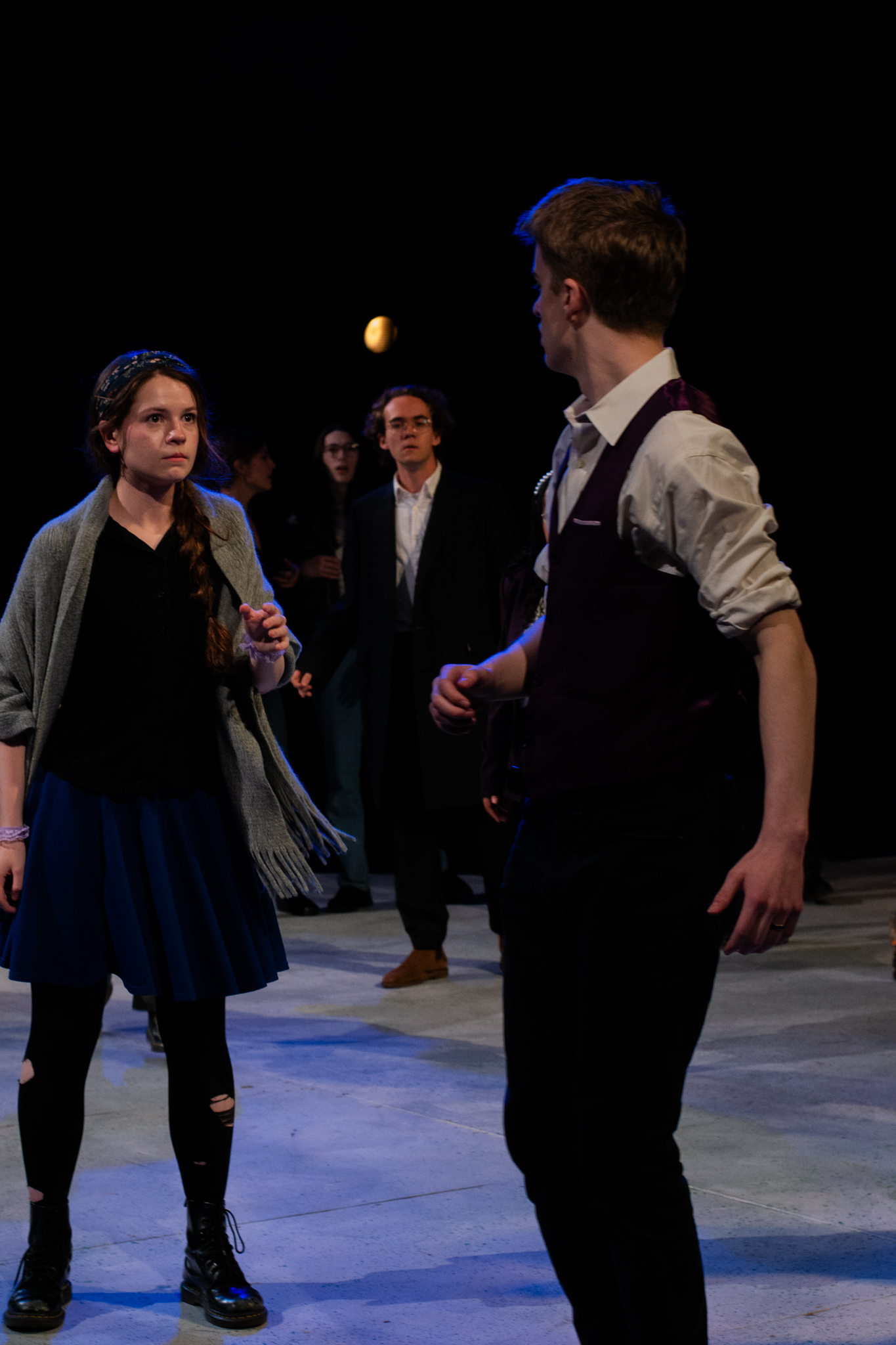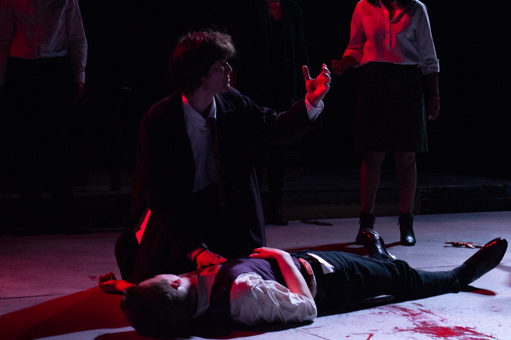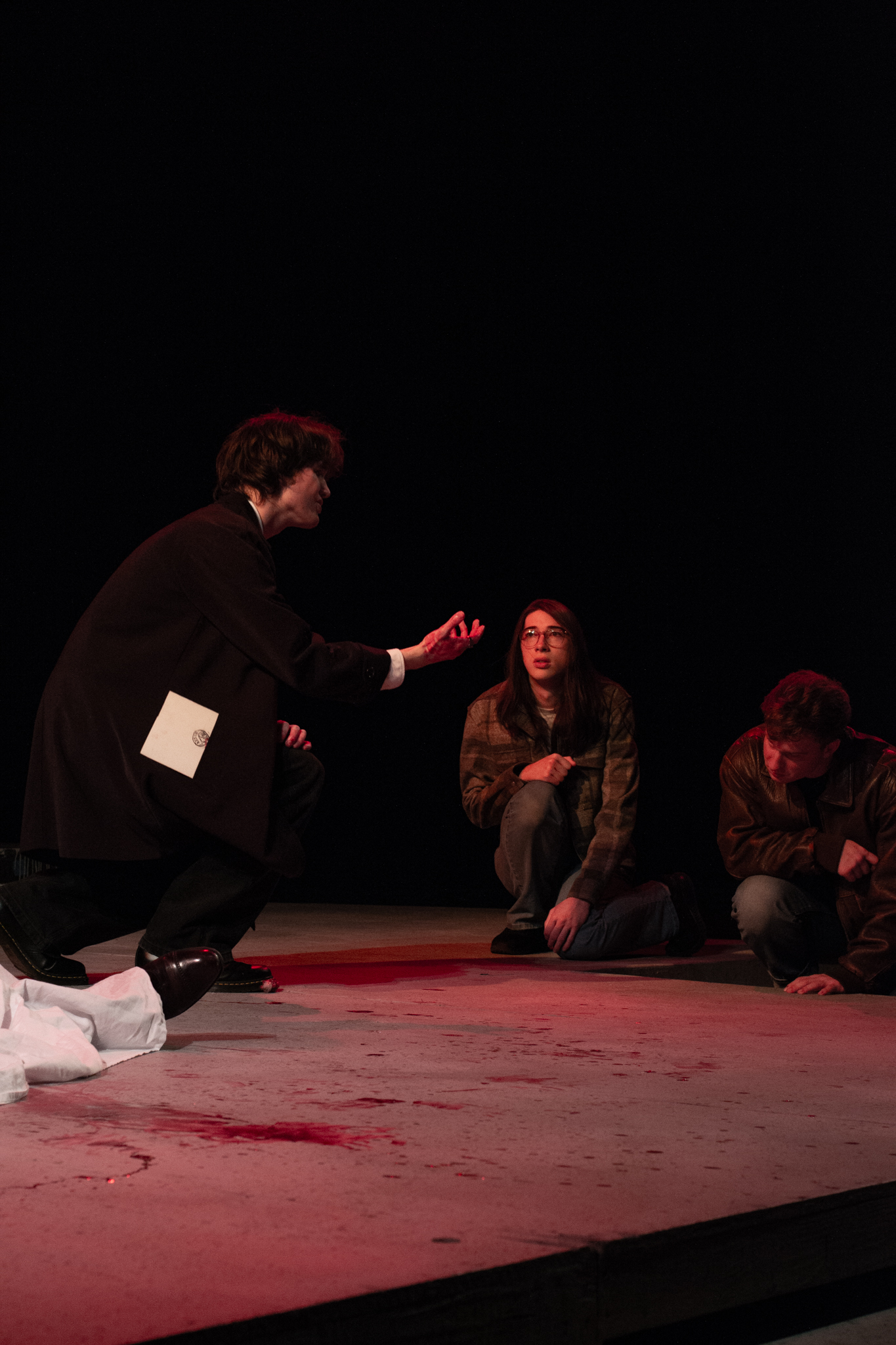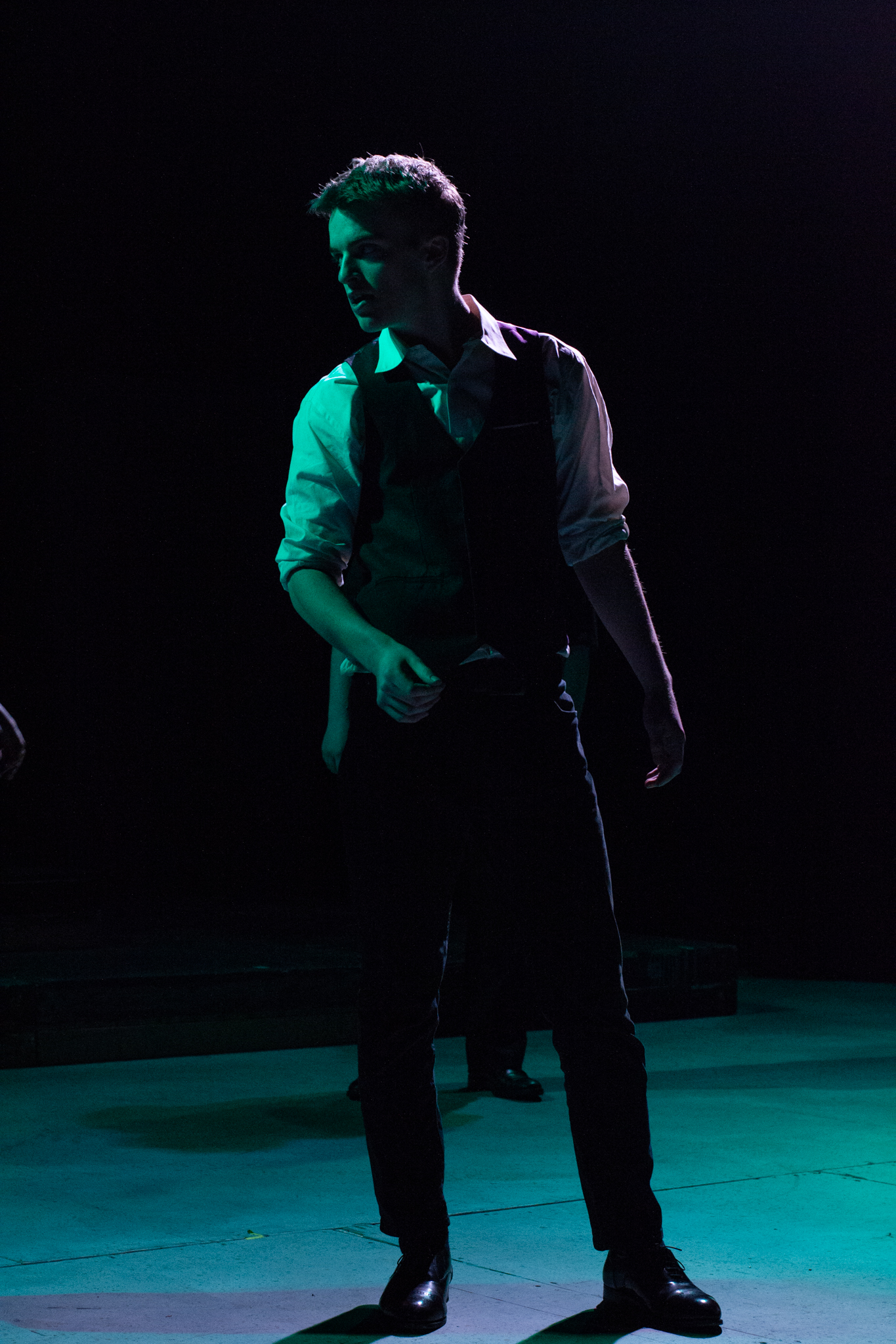 To do this, my version of the play took two minor characters – the Soothsayer, who tells Caesar to beware the ides of March, and Lucius, Brutus’s servant – and expanded them to be show-spanning physical narrators of the story, so that the audience would experience the events of the play through their eyes. In practical terms, this meant melding a number of different minor characters into two show-spanning tracks, heavily recontextualizing certain scenes, and staging a prologue, epilogue, and multiple interlude sequences to highlight the common people as they experienced the events of the play outside of its explicit text.
