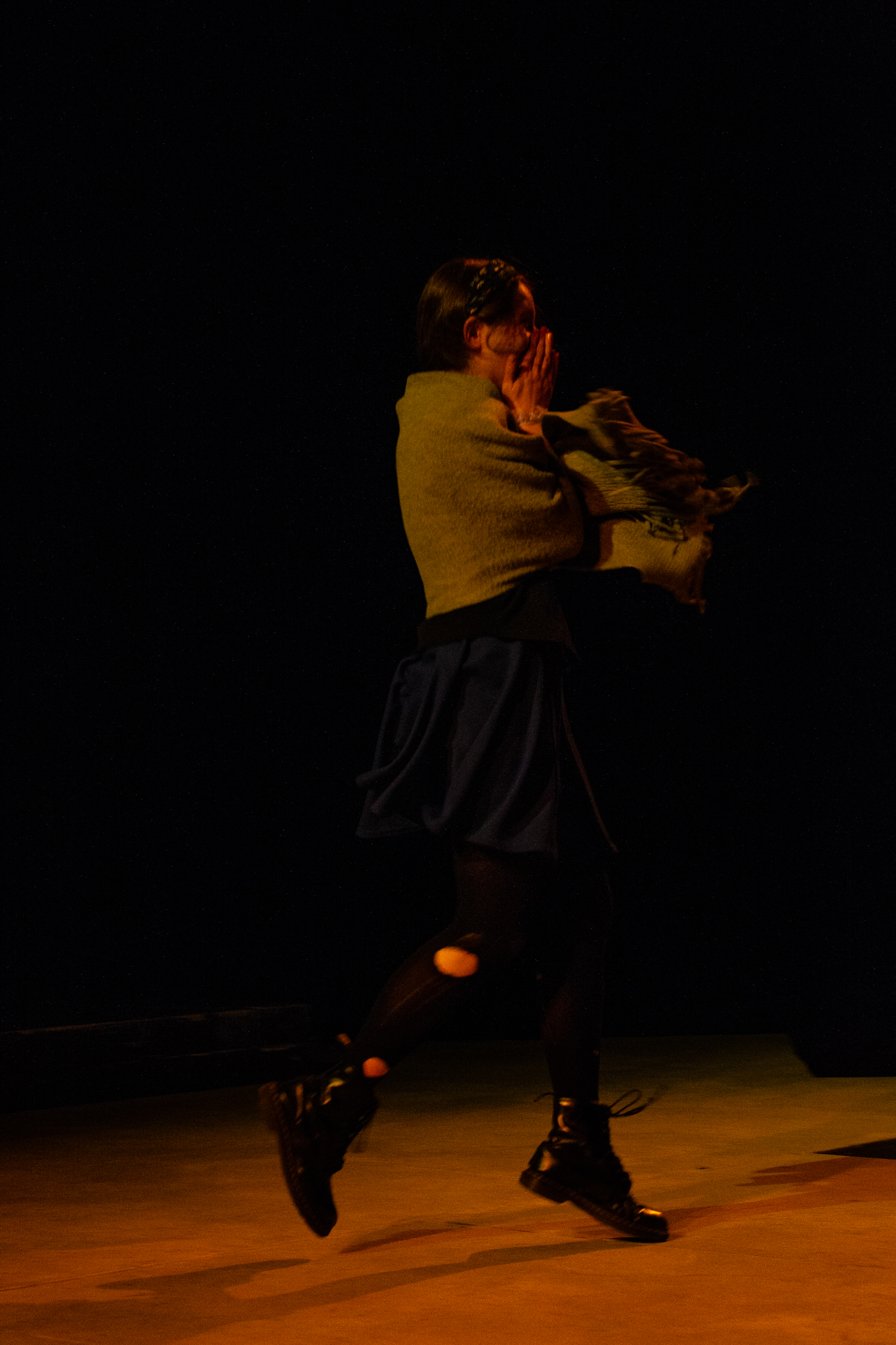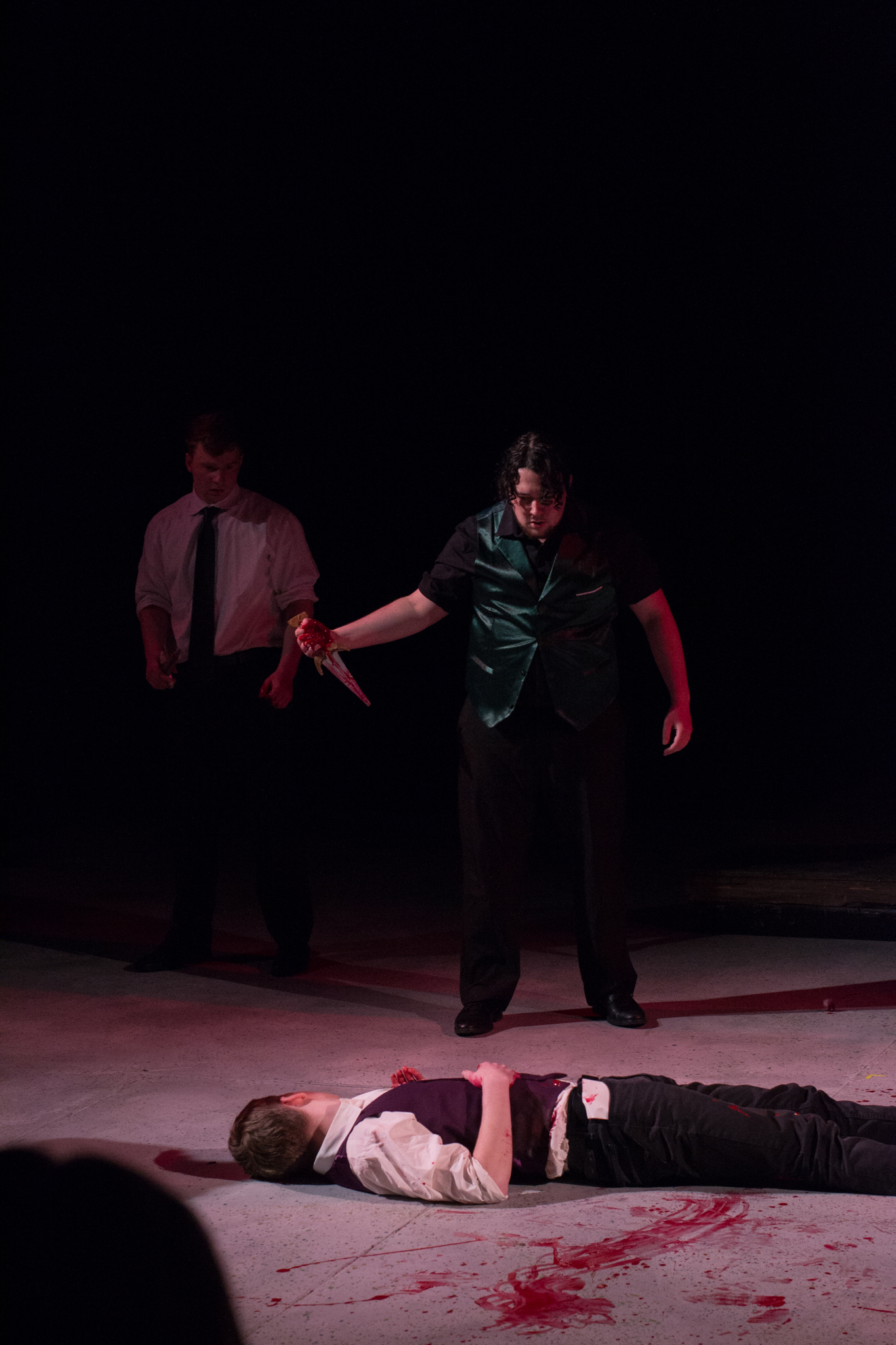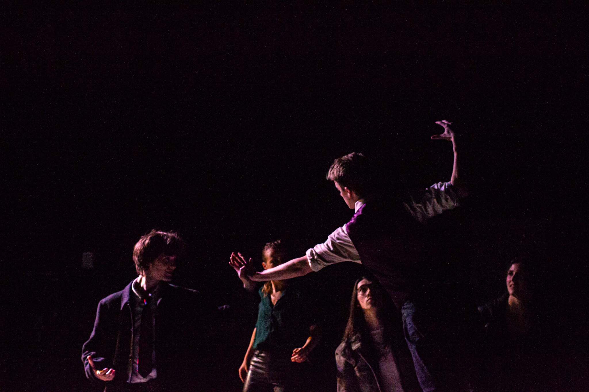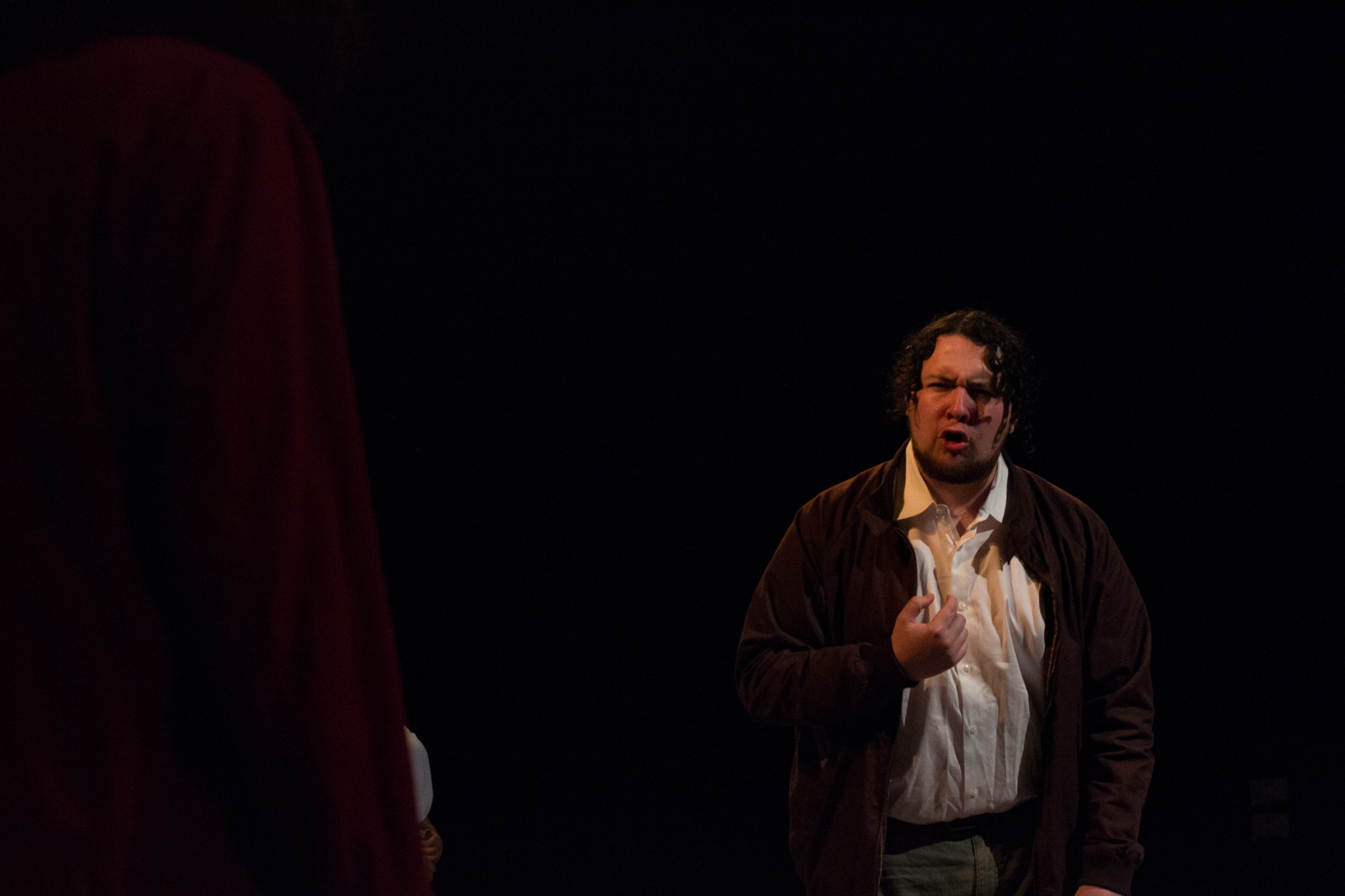 To do this, my version of the play took two minor characters – the Soothsayer, who tells Caesar to beware the ides of March, and Lucius, Brutus’s servant – and expanded them to be show-spanning physical narrators of the story, so that the audience would experience the events of the play through their eyes. In practical terms, this meant melding a number of different minor characters into two show-spanning tracks, heavily recontextualizing certain scenes, and staging a prologue, epilogue, and multiple interlude sequences to highlight the common people as they experienced the events of the play outside of its explicit text.